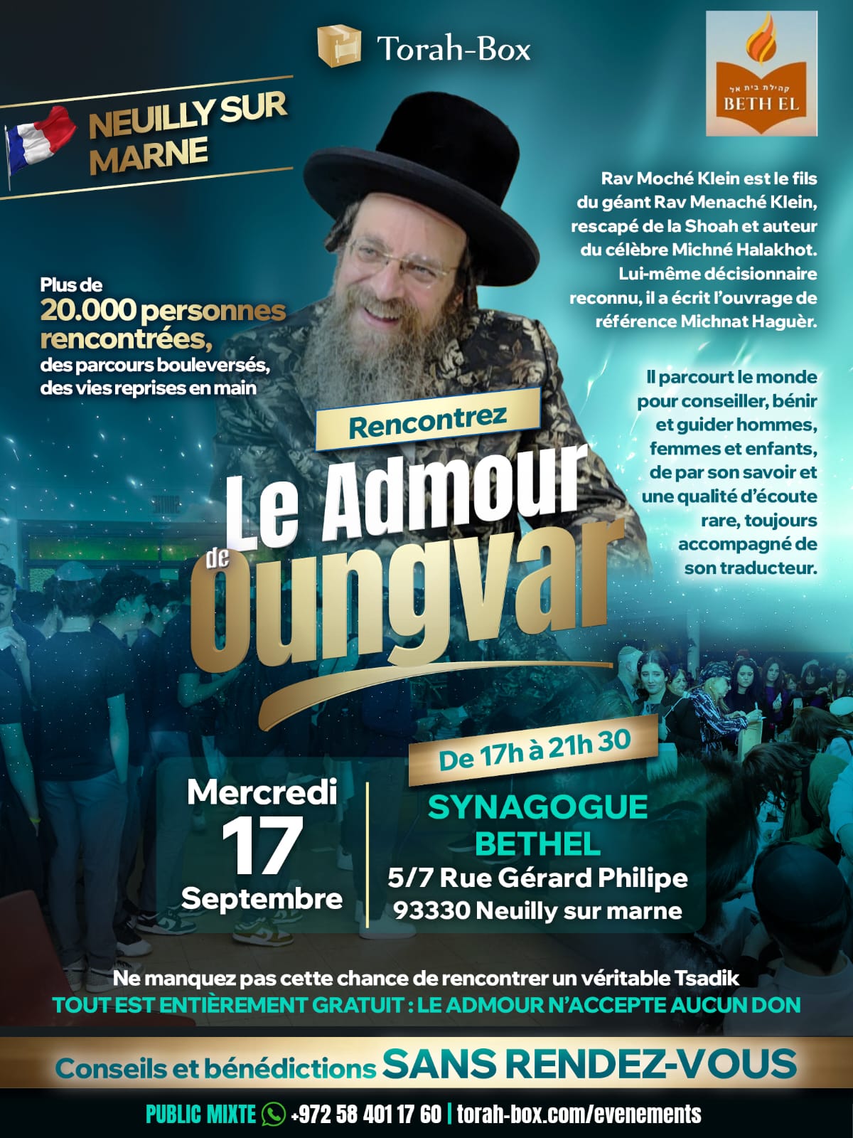 Nous avons la chance de recevoir un grand Rav pour recevoir des Berahots avec la possibilité de rendez vous privés le 17 septembre ne ratez pas cette occasion et notez la date sur vos agendas.